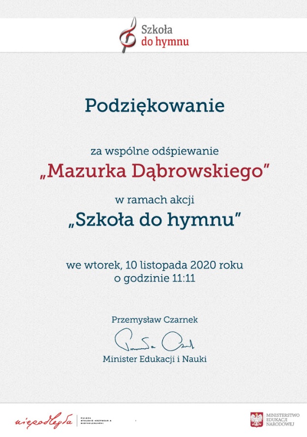 Start » Z życia szkoły » Podziękowanie za wspólne odśpiewanie „Mazurka Dąbrowskiego” w ramach akcji „ Szkoła do hymnu” 2020 » Podziękowanie szkołą do hymnu